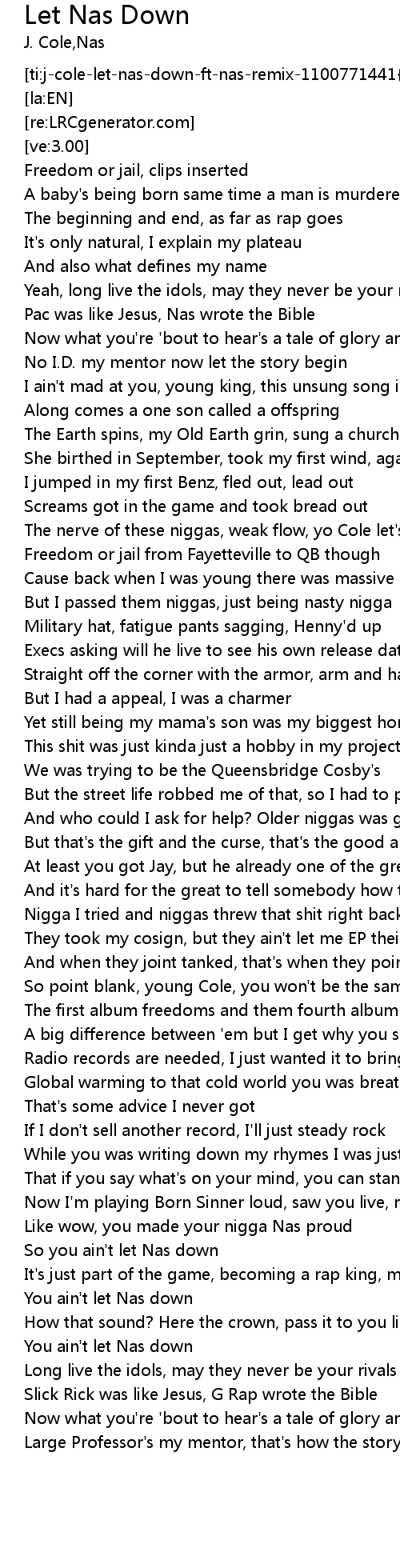 | [00:40.66] | The nerve of these niggas, weak flow, yo Cole let's murder this sequel |