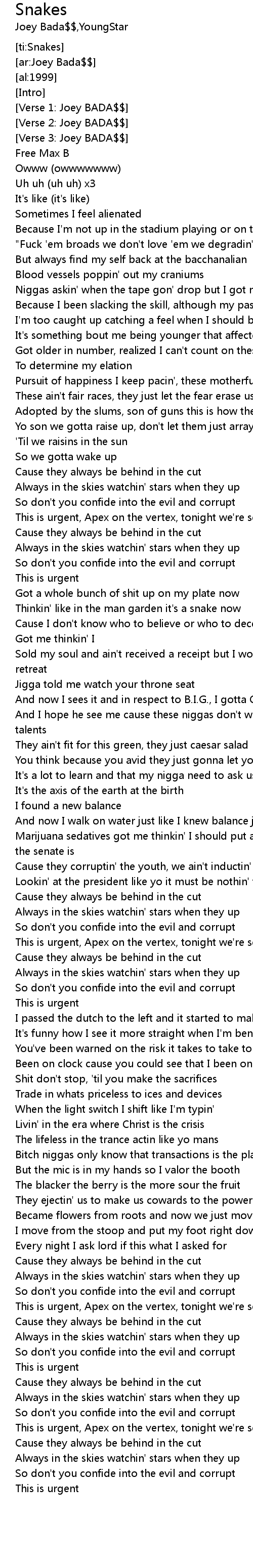 | [01:16.21] | This is urgent, Apex on the vertex, tonight we're serving serpents |