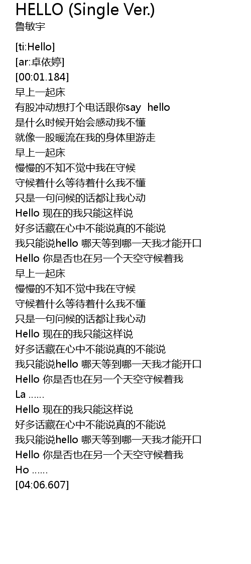 | [03:22.838] | Hello xiàn zài de wǒ zhǐ néng zhè yàng shuō |