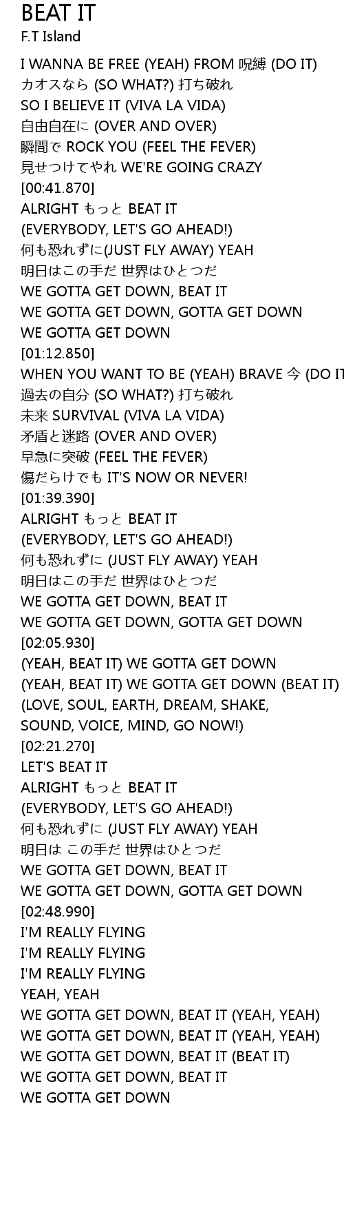 | [02:07.100] | (YEAH, BEAT IT) WE GOTTA GET DOWN |