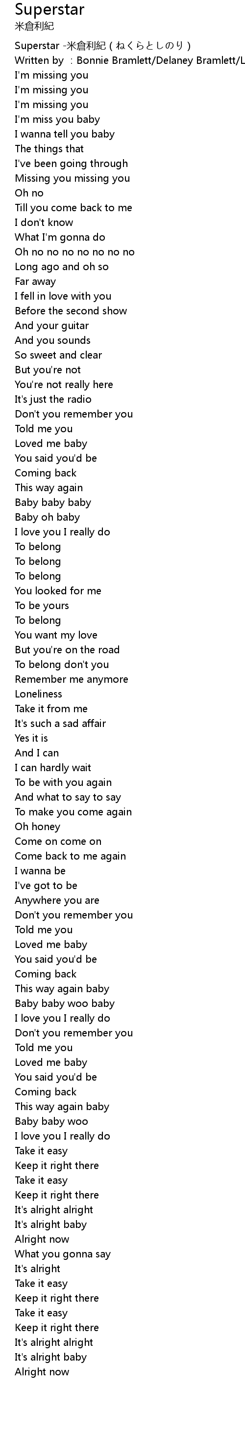 | [00:06.133] | Written by :Bonnie Bramlett/Delaney Bramlett/Leon Russell |