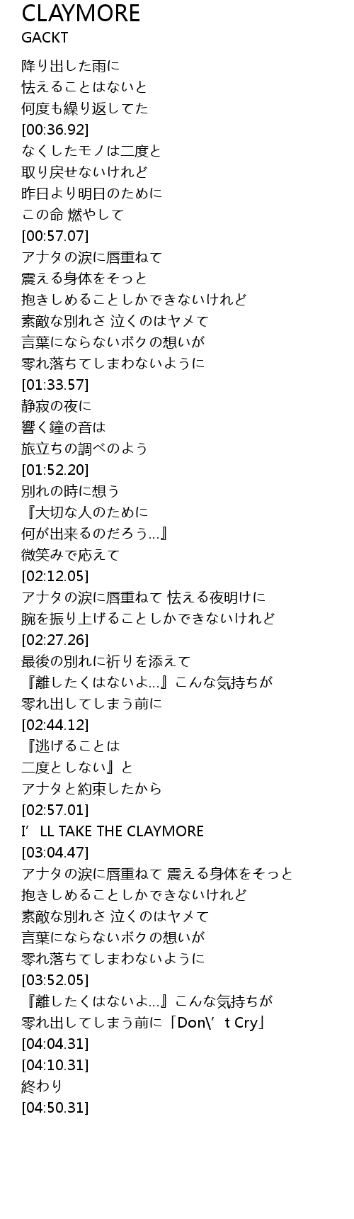| [03:59.06] | 零れ出してしまう前に「Don\’t Cry」 |