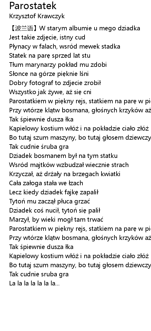 | [01:44.85] | Parostatkiem w pi kny rejs, statkiem na par w pi kny rejs |