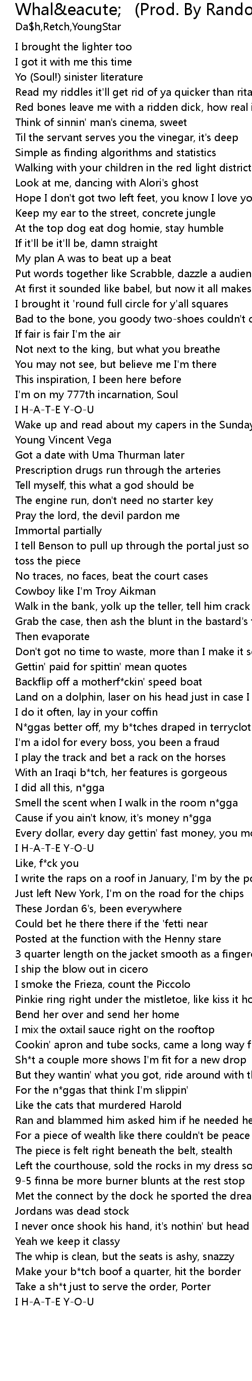| [02:22.304] | Smell the scent when I walk in the room n*gga |