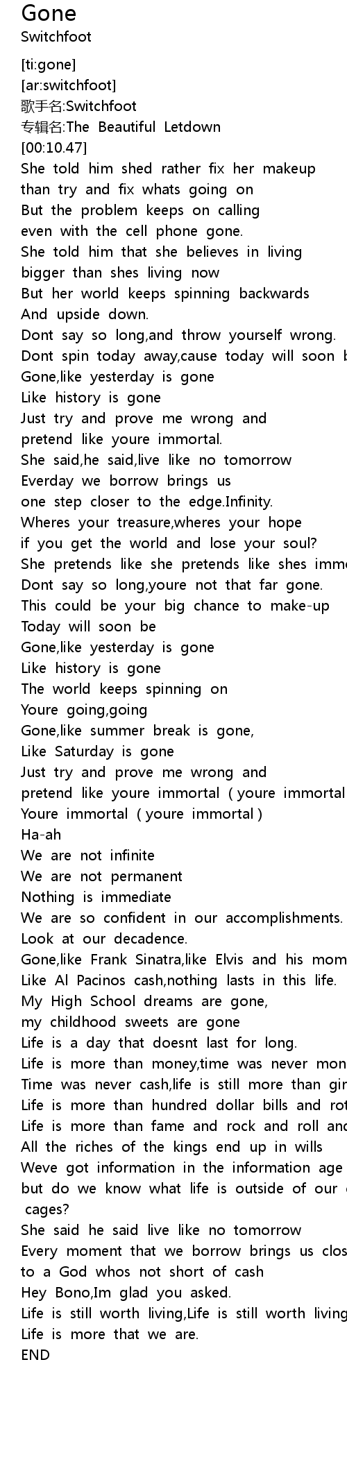 | [00:48.180] | Dont spin today away, cause today will soon be |