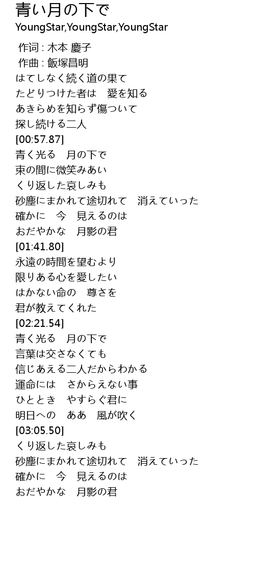 | [00:59.19] | 青く光る 月の下で |