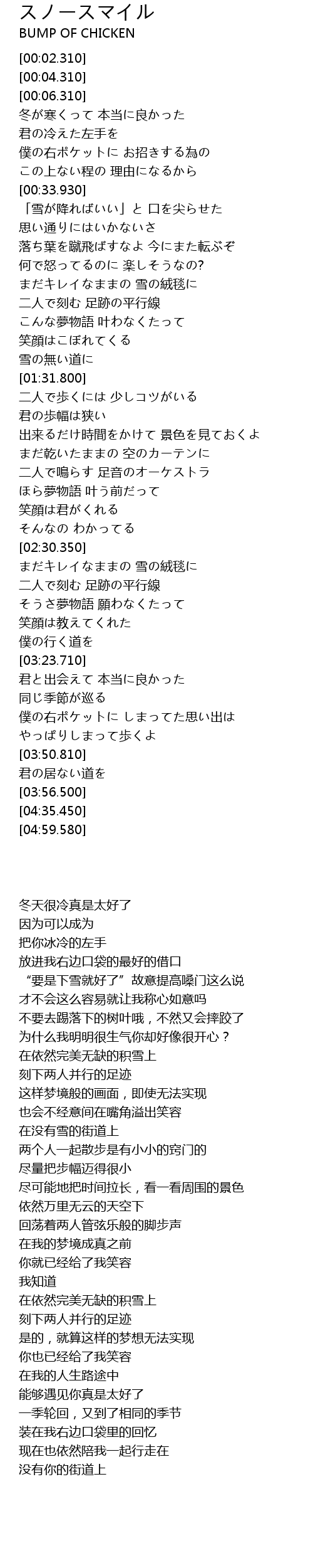 | [02:53.300] | まだキレイなままの 雪の絨毯に |