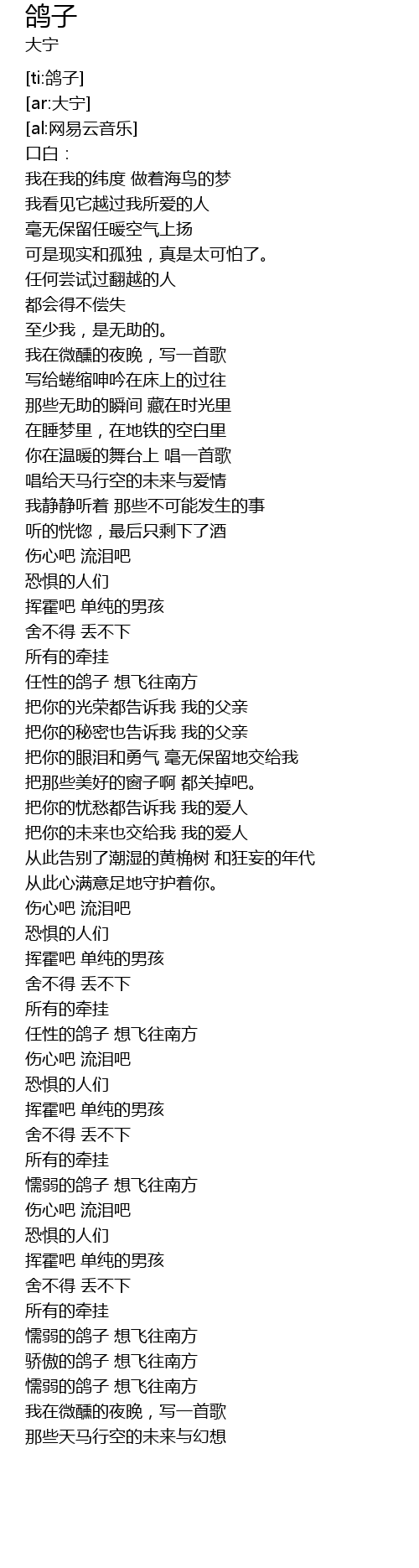 | [03:36.32] | 任性的鸽子 想飞往南方 |