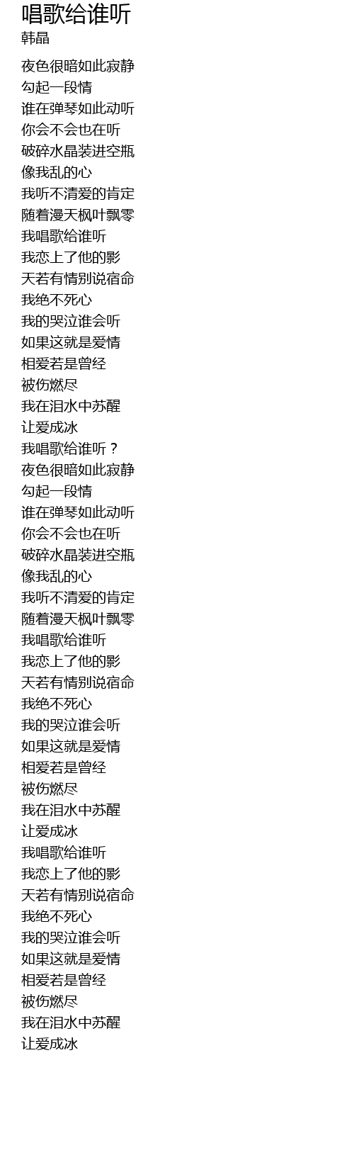 | [01:38.700] | wǒ chàng gē gěi shuí tīng? |