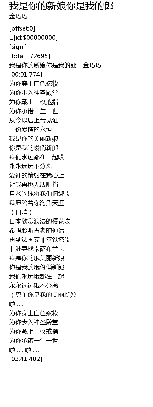 | [00:00.809] | 我是你的新娘你是我的郎 - 金巧巧 |