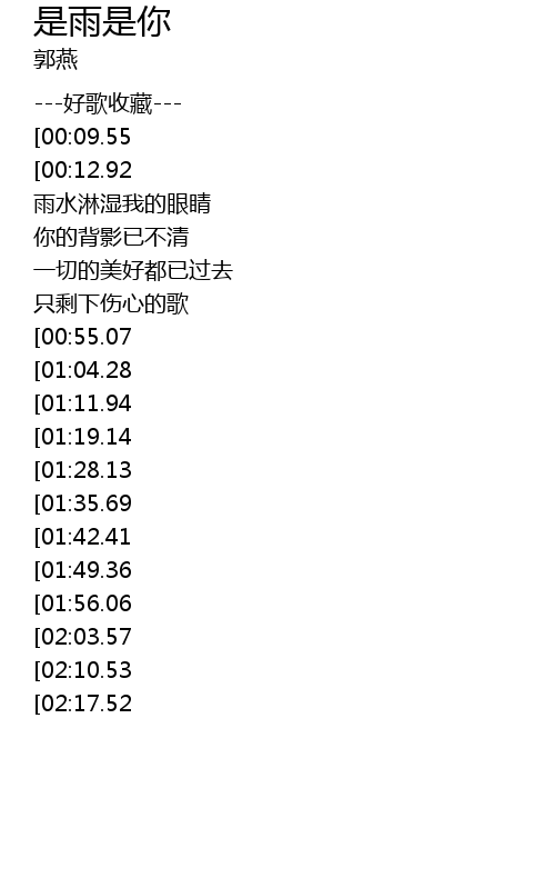 | [02:31.37][00:09.55] | 郭燕 - 是雨是你 |