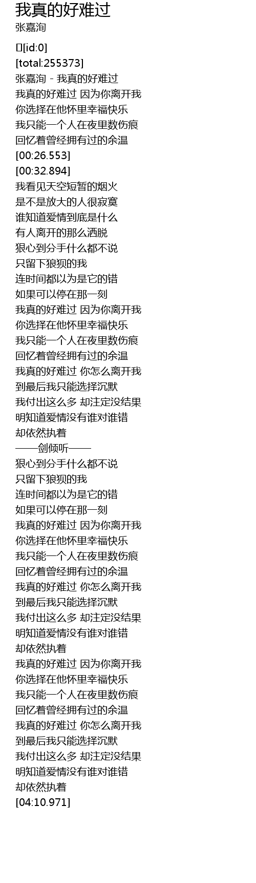 | [00:00.887] | 张嘉洵 - 我真的好难过 |