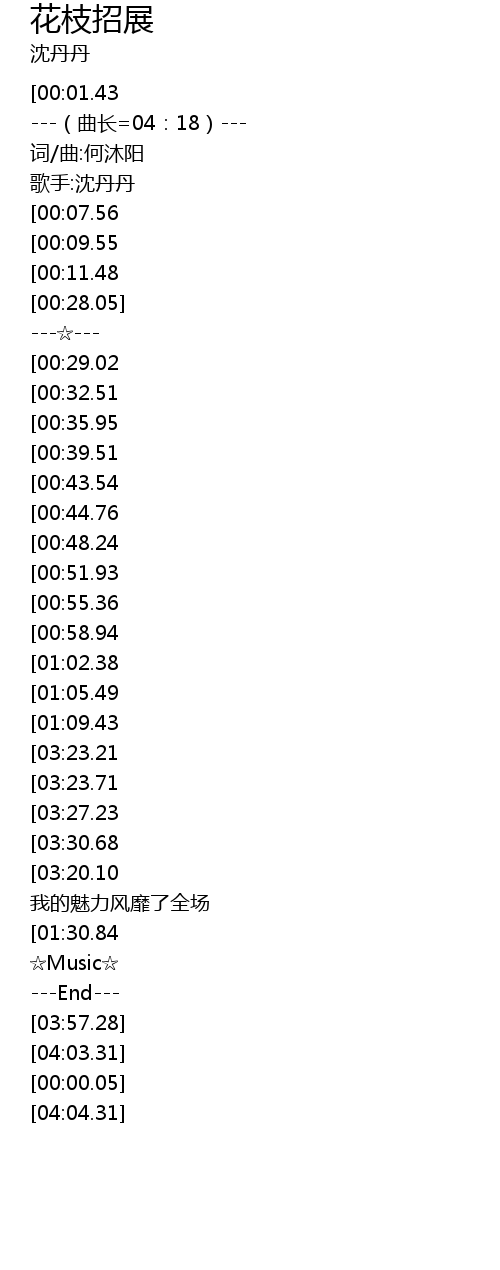 | [01:34.42][00:01.43] | 《花枝招展》-沈丹丹 |