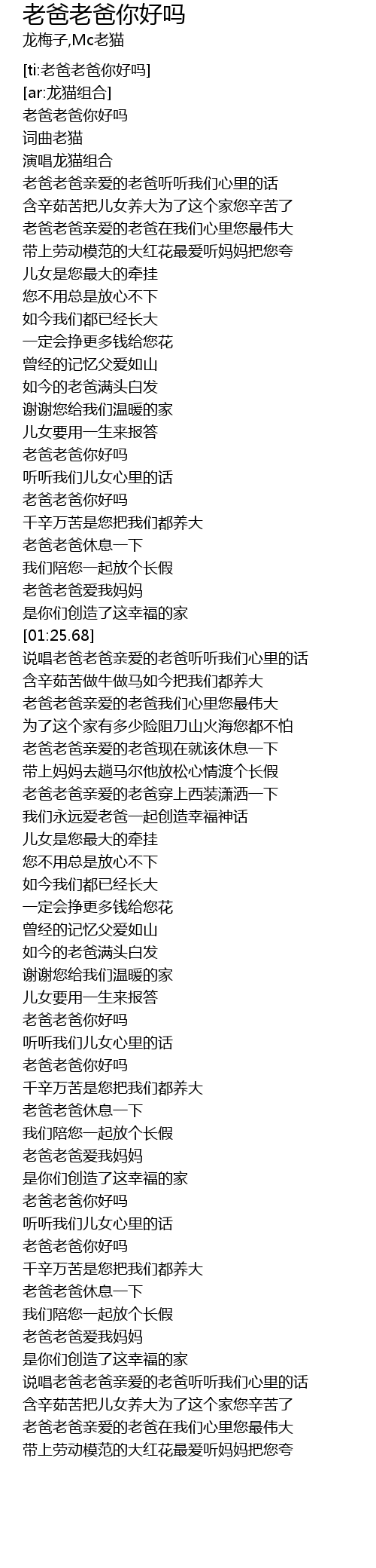| [00:05.51] | 老爸老爸亲爱的老爸听听我们心里的话 |