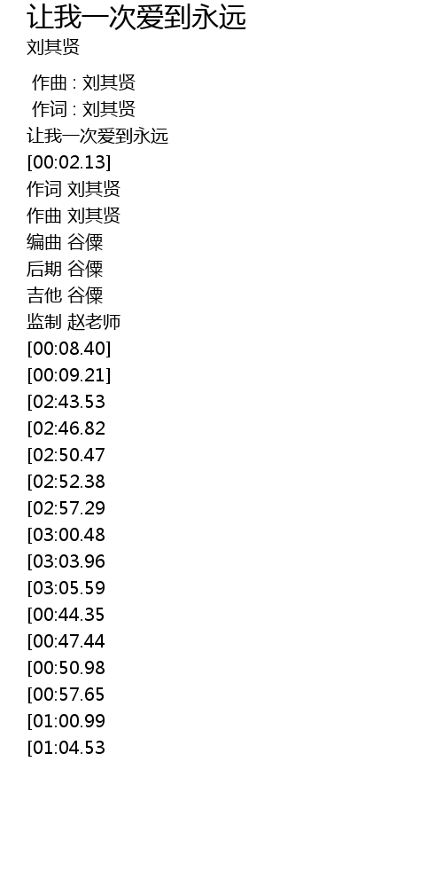 | [03:11.64][02:43.53][01:11.56][00:10.03] | 让我一次爱到永远 |