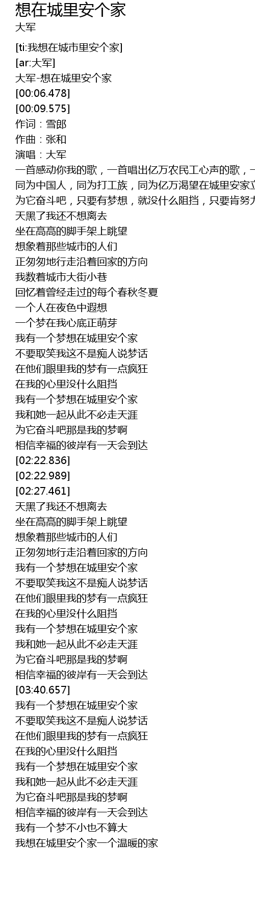 | [04:17.72] | 我想在城里安个家一个温暖的家 |