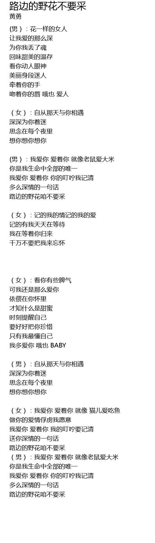 | (女):我爱你 爱着你 就像 猫儿爱吃鱼 | |