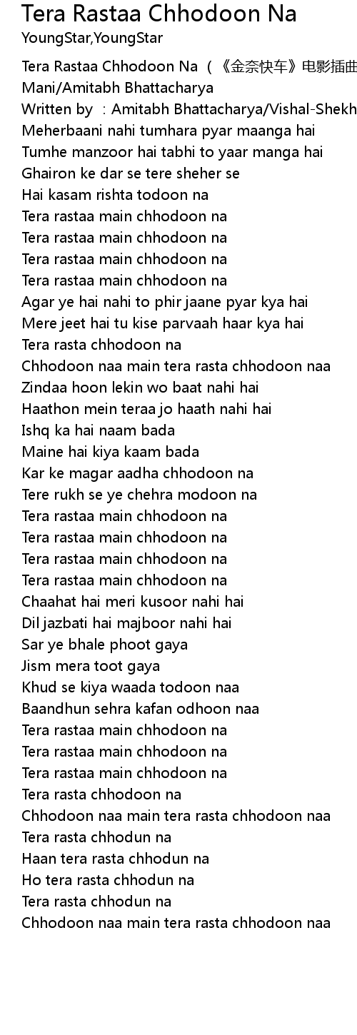 | [00:01.130] | Tera Rastaa Chhodoon Na jin nai kuai che dian ying cha qu Anusha Mani Amitabh Bhattacharya |