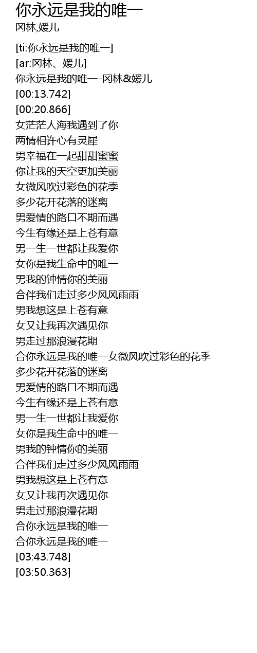 | [00:03.52] | 你永远是我的唯一-冈林&媛儿 |