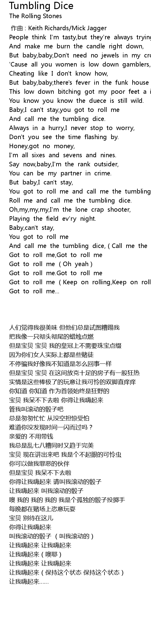 | [02:23.598] | And call me the tumbling dice,(Call me the tumbling) |