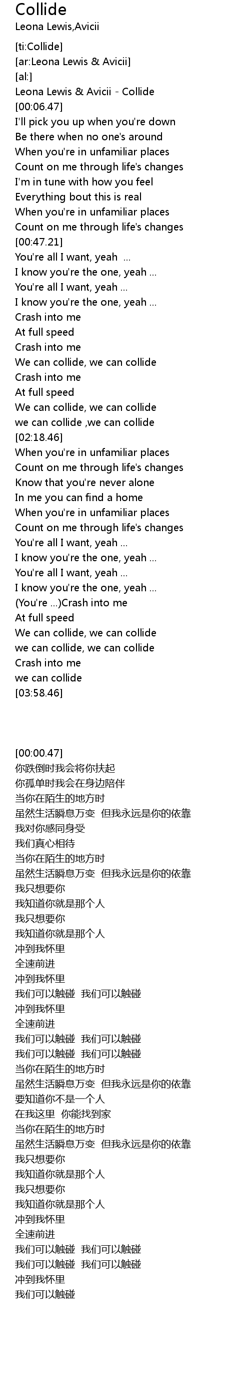 | [00:00.47] | Leona Lewis & Avicii - Collide |
