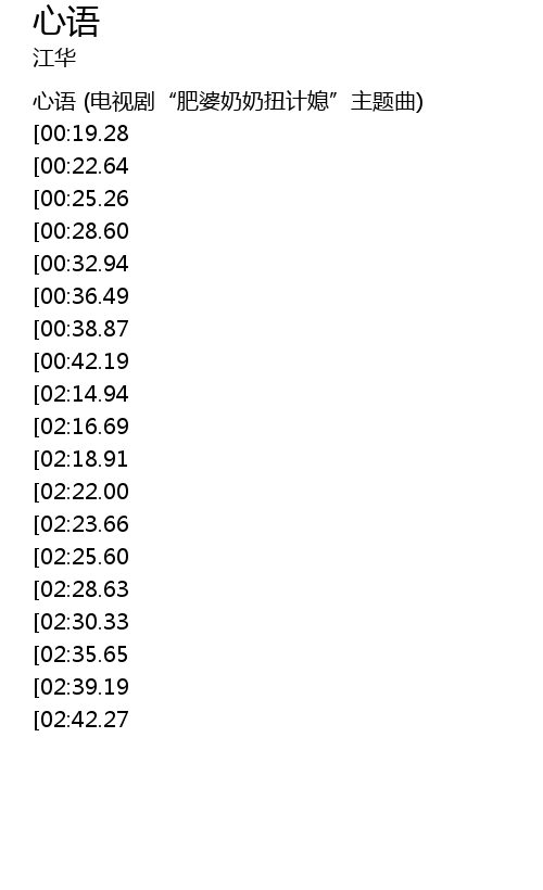 | [00:02.45] | 心语 (电视剧“肥婆奶奶扭计媳”主题曲) |