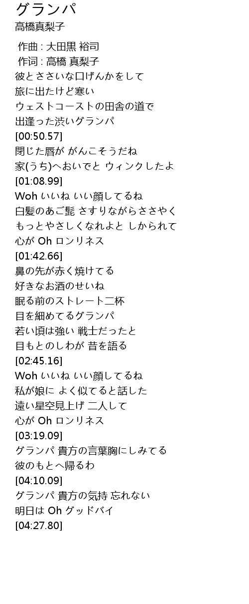| [03:54.18] | グランパ 貴方の言葉胸にしみてる |