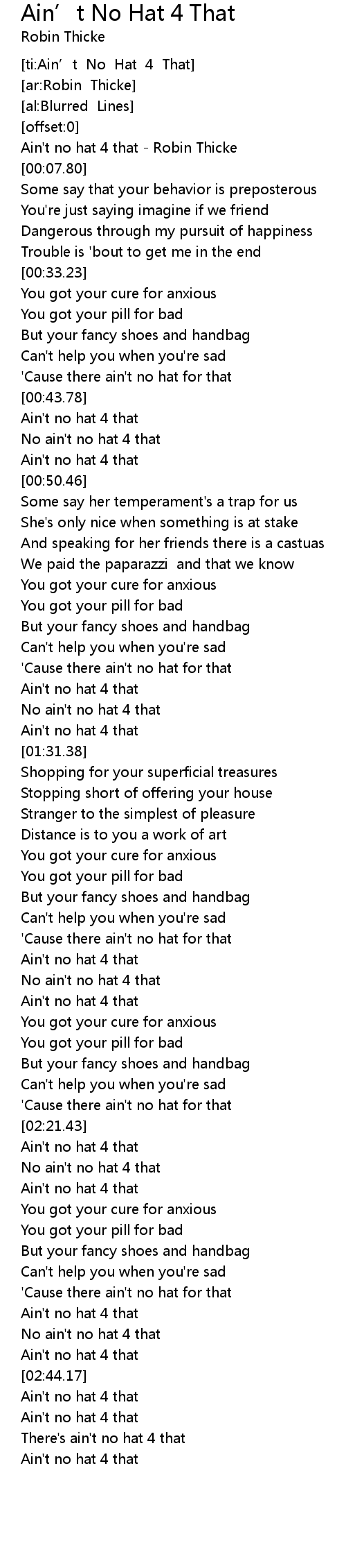 | [00:00.75] | Ain't no hat 4 that - Robin Thicke |