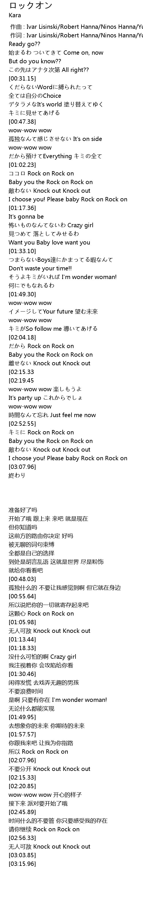 | [02:20.85][02:15.33] | I choose you! Please baby Rock on Rock on |