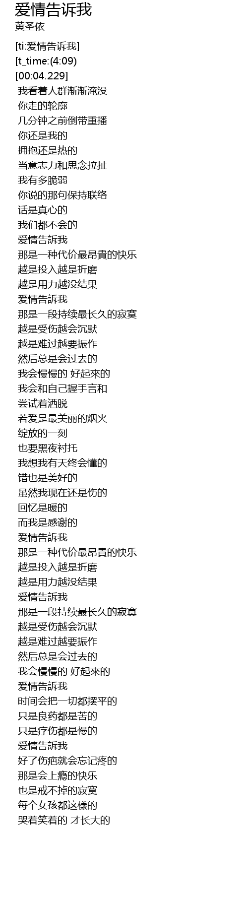 | [00:01.400][t_time:(4:09)] | huáng shèng yī ài qíng gào sù wǒ |