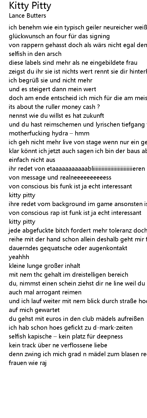 | von rappern gehasst doch als wärs nicht egal denn die medien kriechen uns seit selfish in den arsch | |