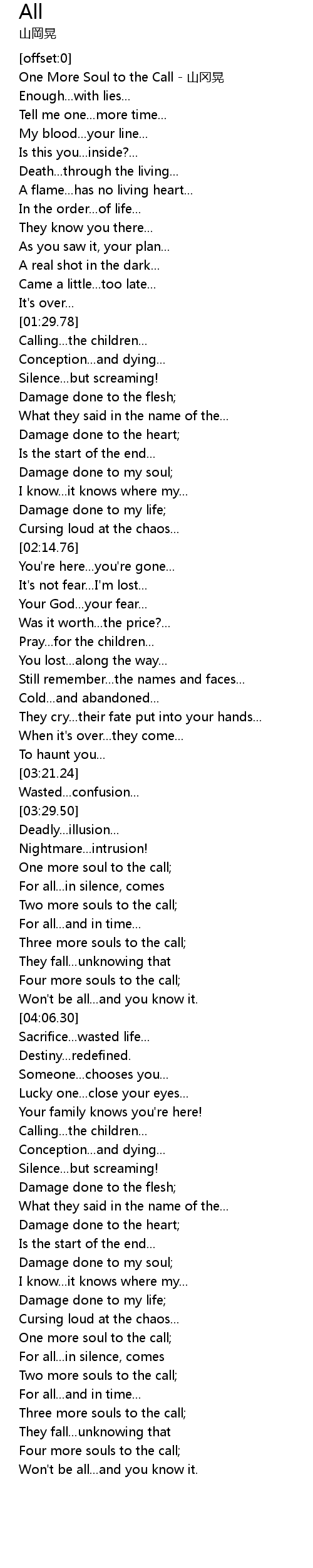 | [00:02.99] | One More Soul to the Call shān gāng huǎng |