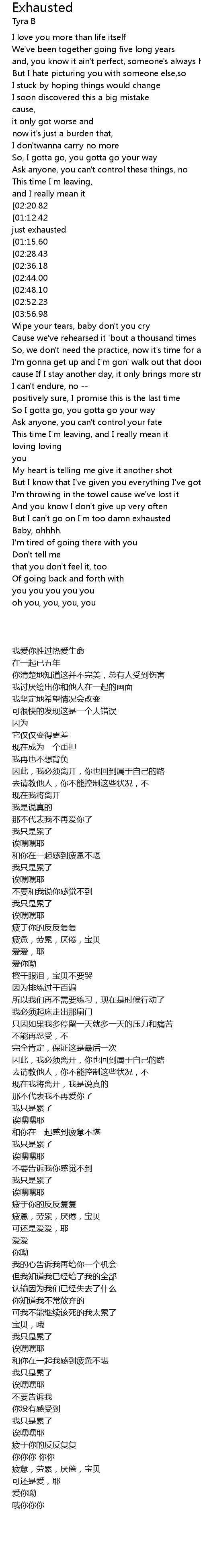 | [01:29.34][02:48.10][03:51.80] | Exhausted, tired, fed up, baby |