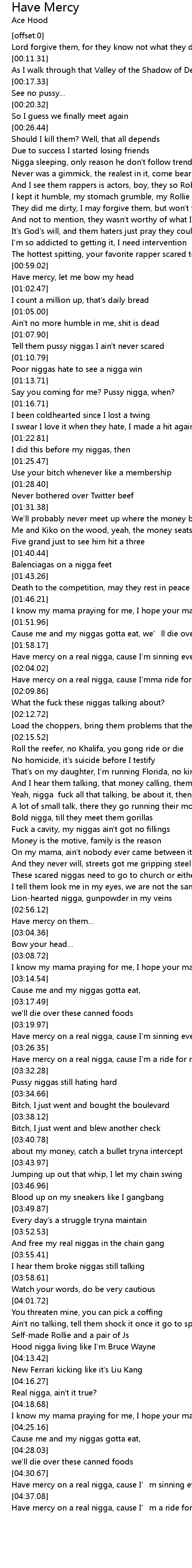 | [03:27.42] | Have mercy on a real nigga, cause I'm a ride for my niggas, dog |