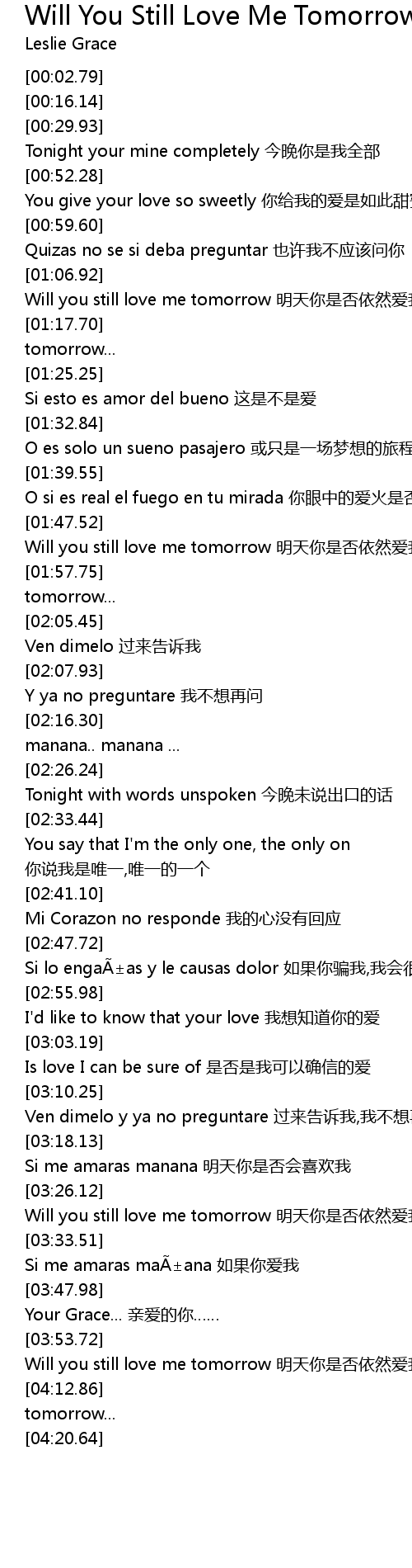 | [03:54.28] | Will you still love me tomorrow míng tiān nǐ shì fǒu yī rán ài wǒ |