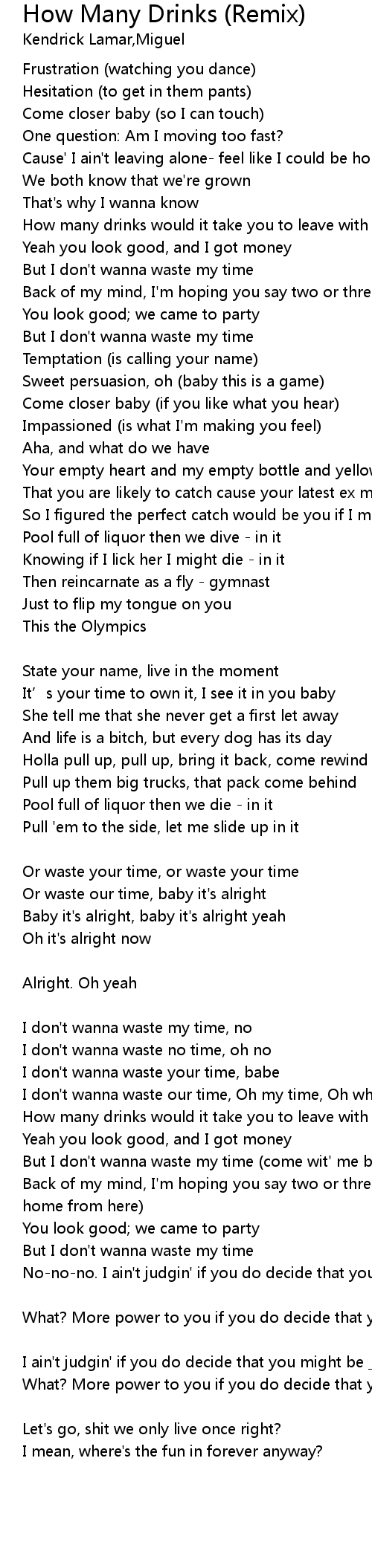 | How many drinks would it take you to leave with me? oh yeah | |