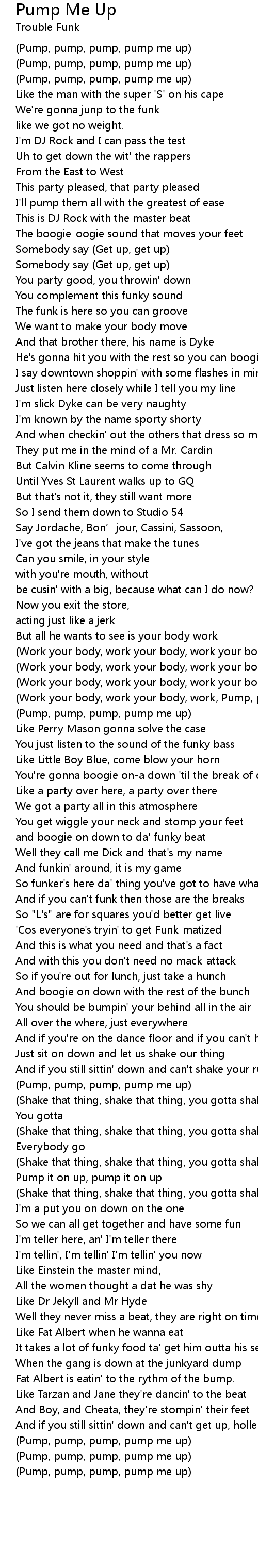 | (Work your body, work your body, work, Pump, pump, pump, pump me up) | |