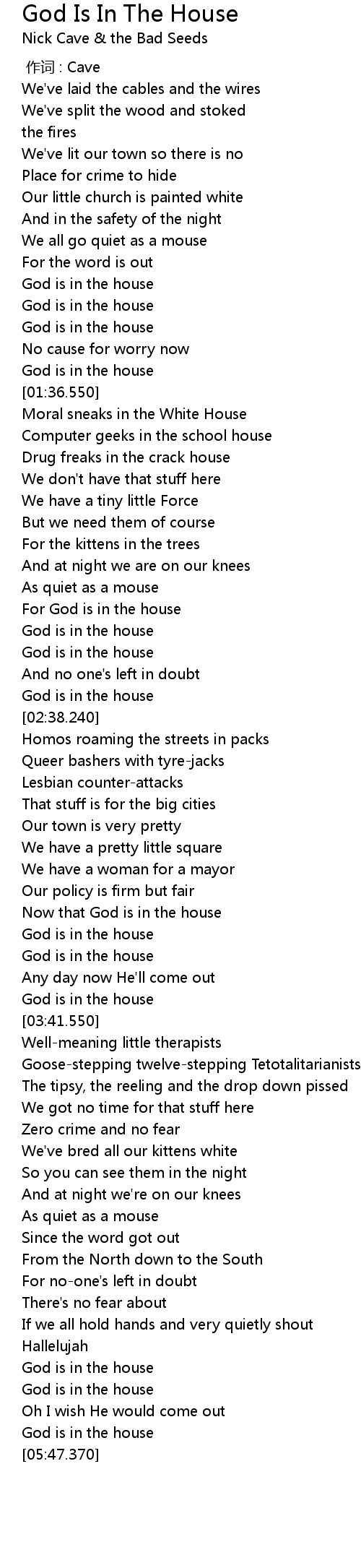 | [03:33.000] | God is in the house |