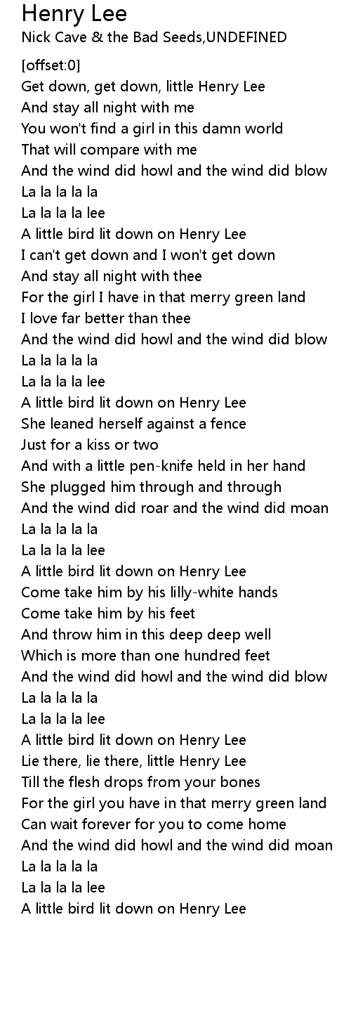 | [00:17.320] | Get down, get down, little Henry Lee |