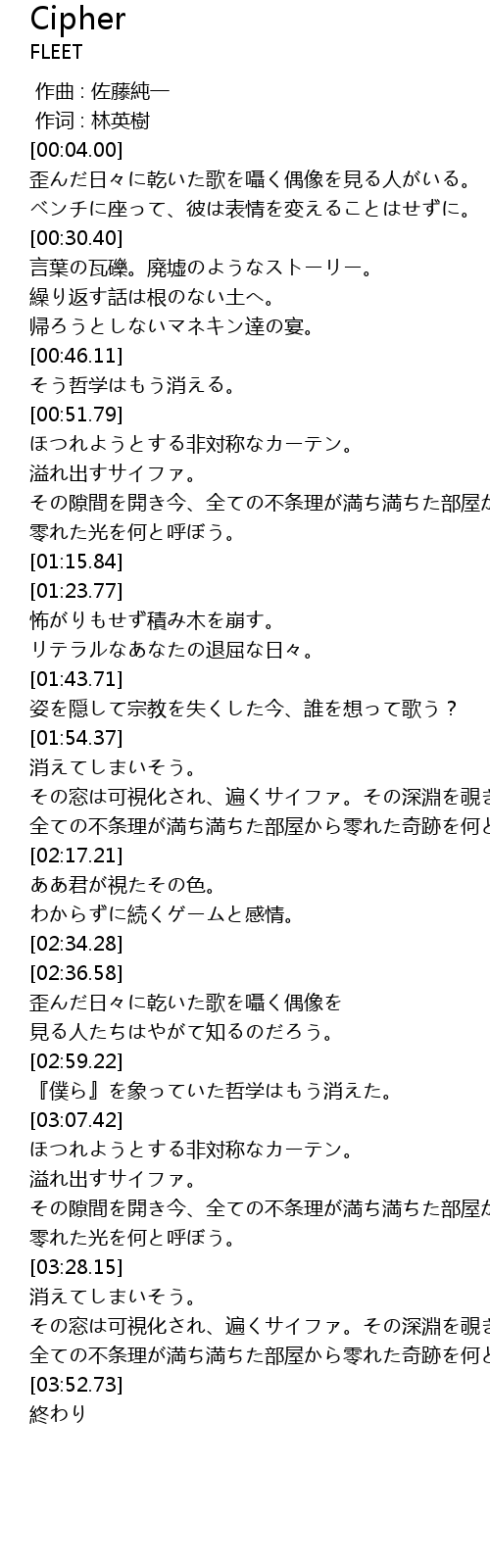 | [03:30.78] | その窓は可視化され、遍くサイファ。その深淵を覗き見る。 |