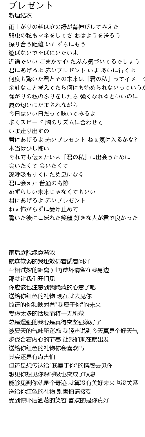 | [03:38.93] | 君にあげるよ 赤いプレゼント ねぇ怖がらずに受け止めて |