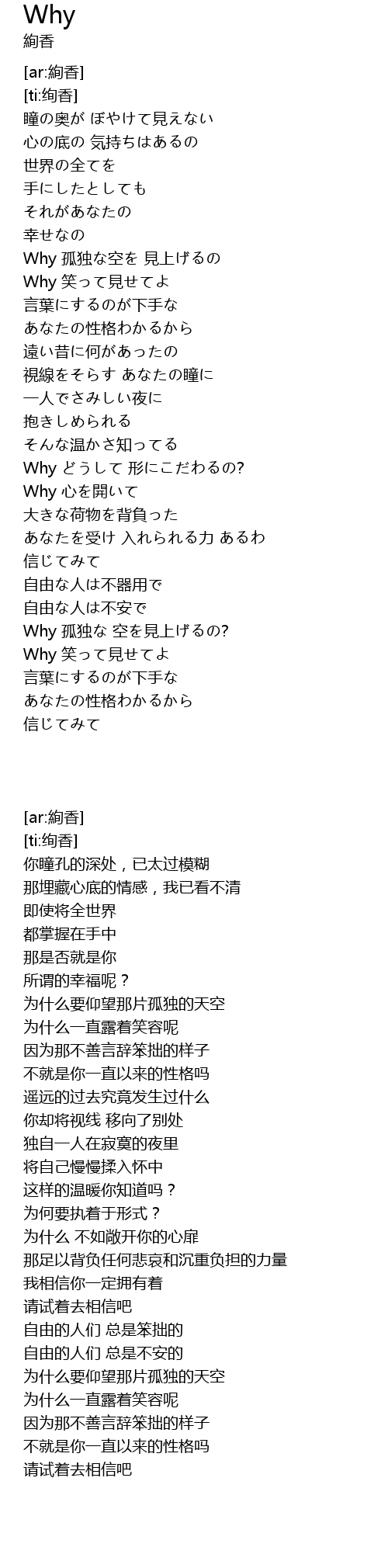 | [00:45.010] | Why 孤独な空を 見上げるの |