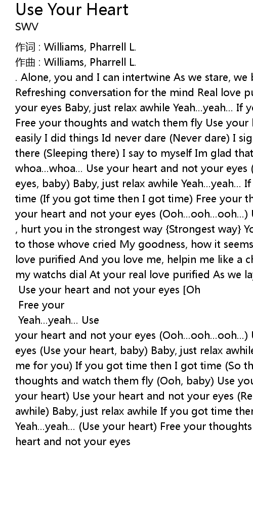 | . Alone, you and I can intertwine As we stare, we both seek and hope to find Refreshing conversation for the mind Real love purified Use your heart and not your eyes Baby, just relax awhile Yeah...yeah... If you got time then I got time Free your thoughts and watch them fly Use your heart and not your eyes (Baby) So easily I did things Id never dare (Never dare) I sigh as I watch you sleepin there (Sleeping there) I say to myself Im glad that we share Real love purified, whoa...whoa... Use your heart and not your eyes (Use your heart and not your eyes, baby) Baby, just relax awhile Yeah...yeah... If you got time then I got time (If you got time then I got time) Free your thoughts and watch them fly Use your heart and not your eyes (Ooh...ooh...ooh...) Use your heart She crushed you , hurt you in the strongest way {Strongest way} Youve hurt so long, reward comes to those whove cried My goodness, how it seems like yesterday {Yesterday} Real love purified And you love me, helpin me like a child Just a second, I look at my watchs dial At your real love purified As we lay, I close my eyes and I smile Baby, just relax awhile [Baby] Use your heart and not your eyes [Oh] If you got time then I got time [If you got the time then I got the time] Free your thoughts and watch them fly [Baby, wont you use your heart] Yeah...yeah... Use your heart and not your eyes (Ooh...ooh...ooh...) Use your heart and not your eyes (Use your heart, baby) Baby, just relax awhile Yeah...yeah... (What is into me for you) If you got time then I got time (So that they can see) Free your thoughts and watch them fly (Ooh, baby) Use your heart and not your eyes (Use your heart) Use your heart and not your eyes (Relax awhile, relax awhile, relax awhile) Baby, just relax awhile If you got time then I got time (Oh...) Yeah...yeah... (Use your heart) Free your thoughts and watch them fly Use your heart and not your eyes |