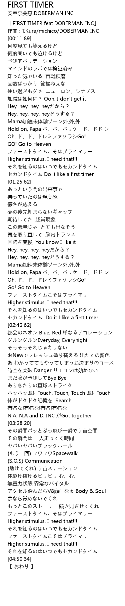 | [00:03.89] | FIRST TIMER feat. DOBERMAN INC |