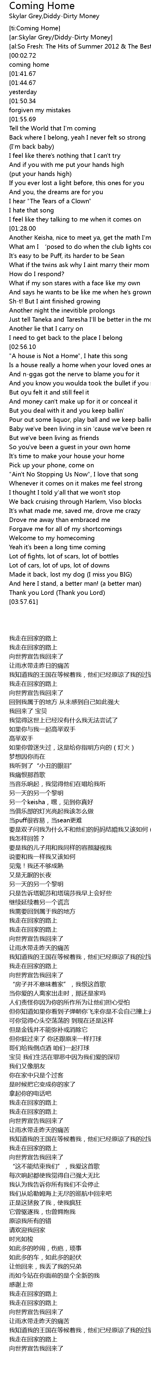 | [00:04.65][01:41.67][02:38.93][03:35.90] | Tell the World I' m coming home |