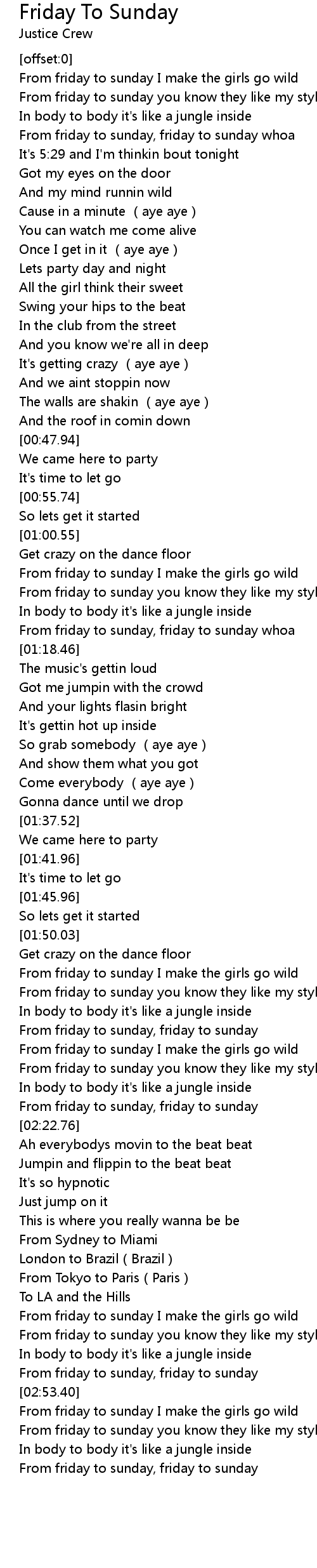 | [00:11.98] | From friday to sunday, friday to sunday whoa |