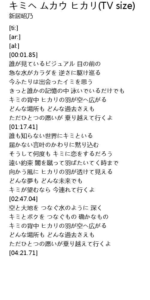 | [00:47.71] | キミの背中 ヒカリの羽が空へ広がる |