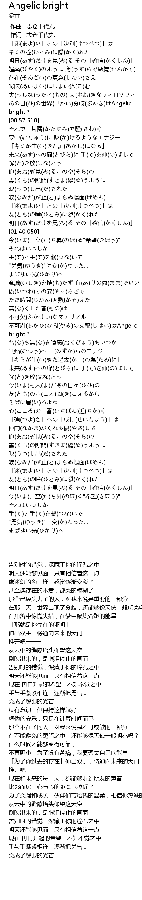 | [00:51.260] | あの日(ひ)の世界(せかい)分岐(ぶんき)はAngelic bright? |