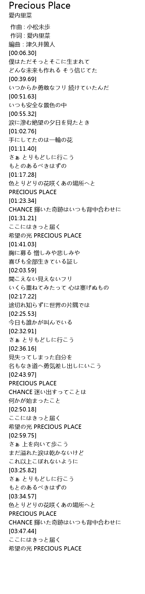 | [01:34.96] | 希望の光 PRECIOUS PLACE |