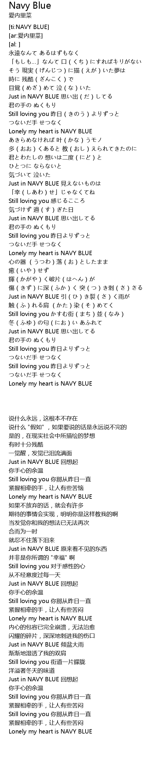 | [01:13.76] | Lonely my heart is NAVY BLUE |